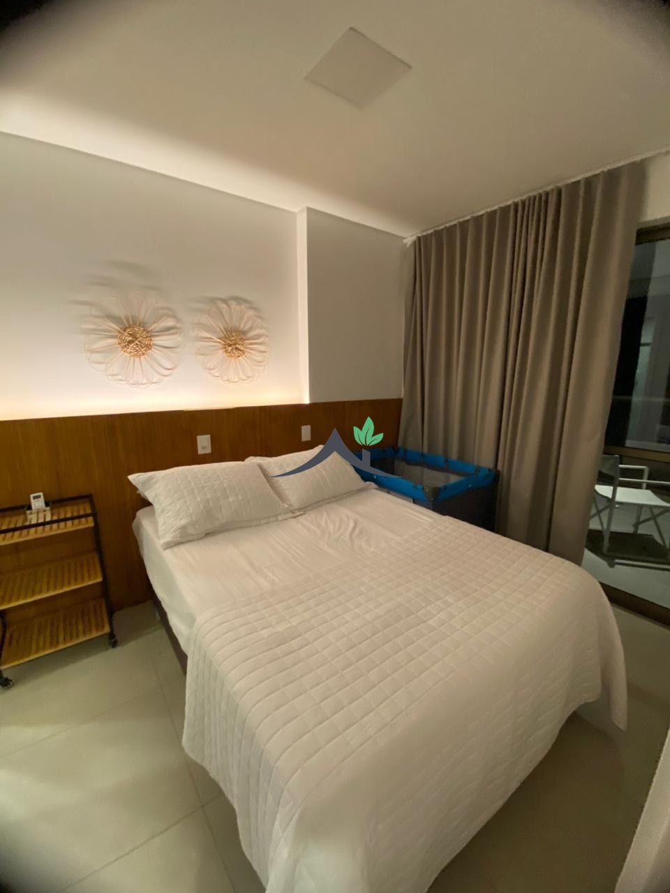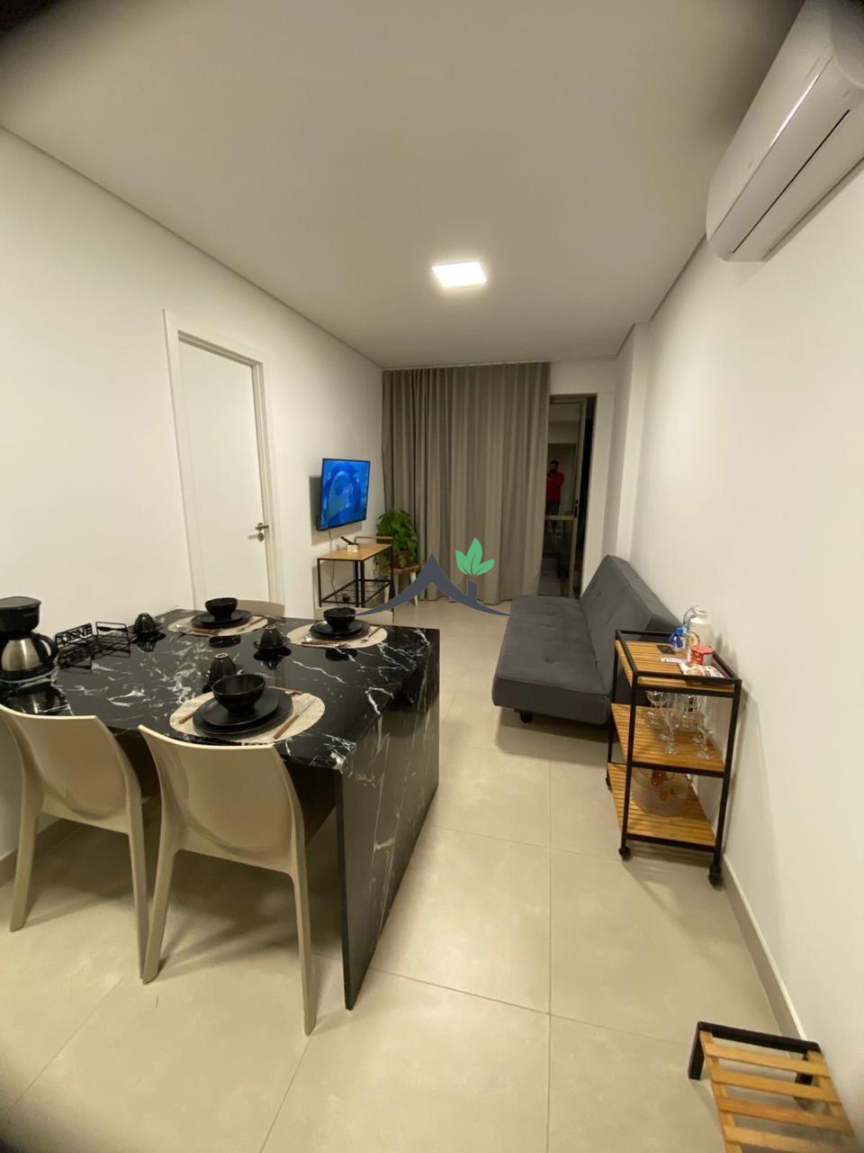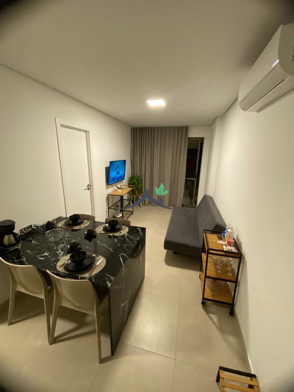 Esse apartamento é completo, mobiliado e decorado, com ar condicionado, varanda, um quarto, um banheiro sendo suíte, cozinha integrada com área de serviço. Com 44m², uma vaga de garagem, prédio com elevador.